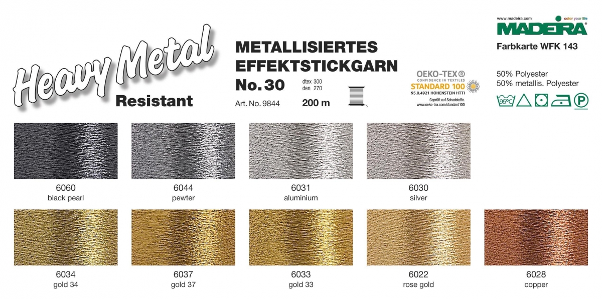 Sukanci Madeira Heavy Metal so izjemno odporni in primerni za pranje pri visokih temperaturah (do 95 °C). So tudi odporni proti beljenju, zato so odlična izbira za džins, športna in delovna oblačila.