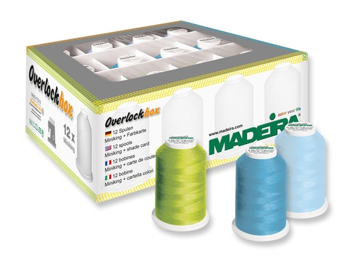 V škatli so 3 barve sukanca Aerolock in ujemajoči se najlonski sukanec Aeroflock.